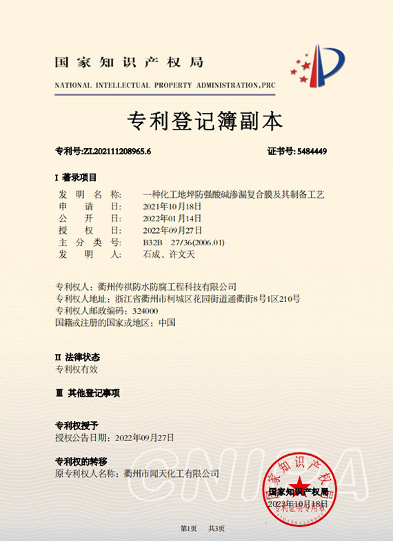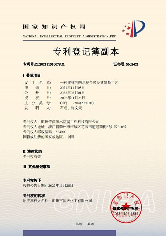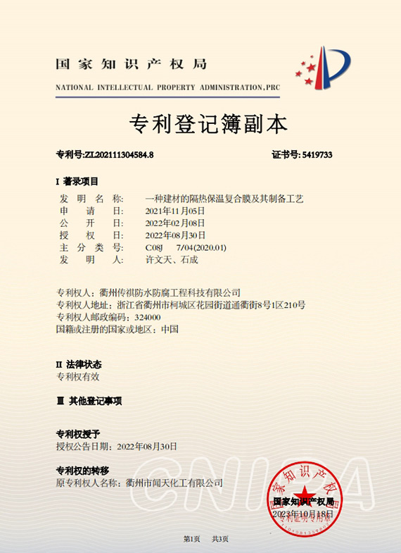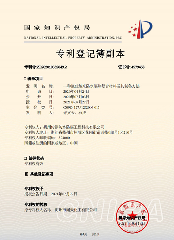 衢州傳祺新材料科技有限公司是衢州市聞天化工有限公司的下屬企業(yè);衢州市聞天化工有限公司成立于2003年,是國(guó)內(nèi)最早研發(fā)、生產(chǎn)氟碳涂料的企業(yè)之一。衢州傳祺新材料科技有限公司成立于2017年,公司專注于高分子氟材料的開發(fā)和含氟材料在防腐、防水領(lǐng)域的應(yīng)用。經(jīng)過6年的不懈努力,已獲得了化工和建筑領(lǐng)域六項(xiàng)國(guó)家發(fā)明專利授權(quán)和兩項(xiàng)新產(chǎn)品科技成果獎(jiǎng),參與了中國(guó)建筑材料流通協(xié)會(huì)《房屋修繕防水工程規(guī)范》標(biāo)準(zhǔn)的編制工作,中建協(xié)涂裝委員會(huì)浙西工作站設(shè)立在我公司。